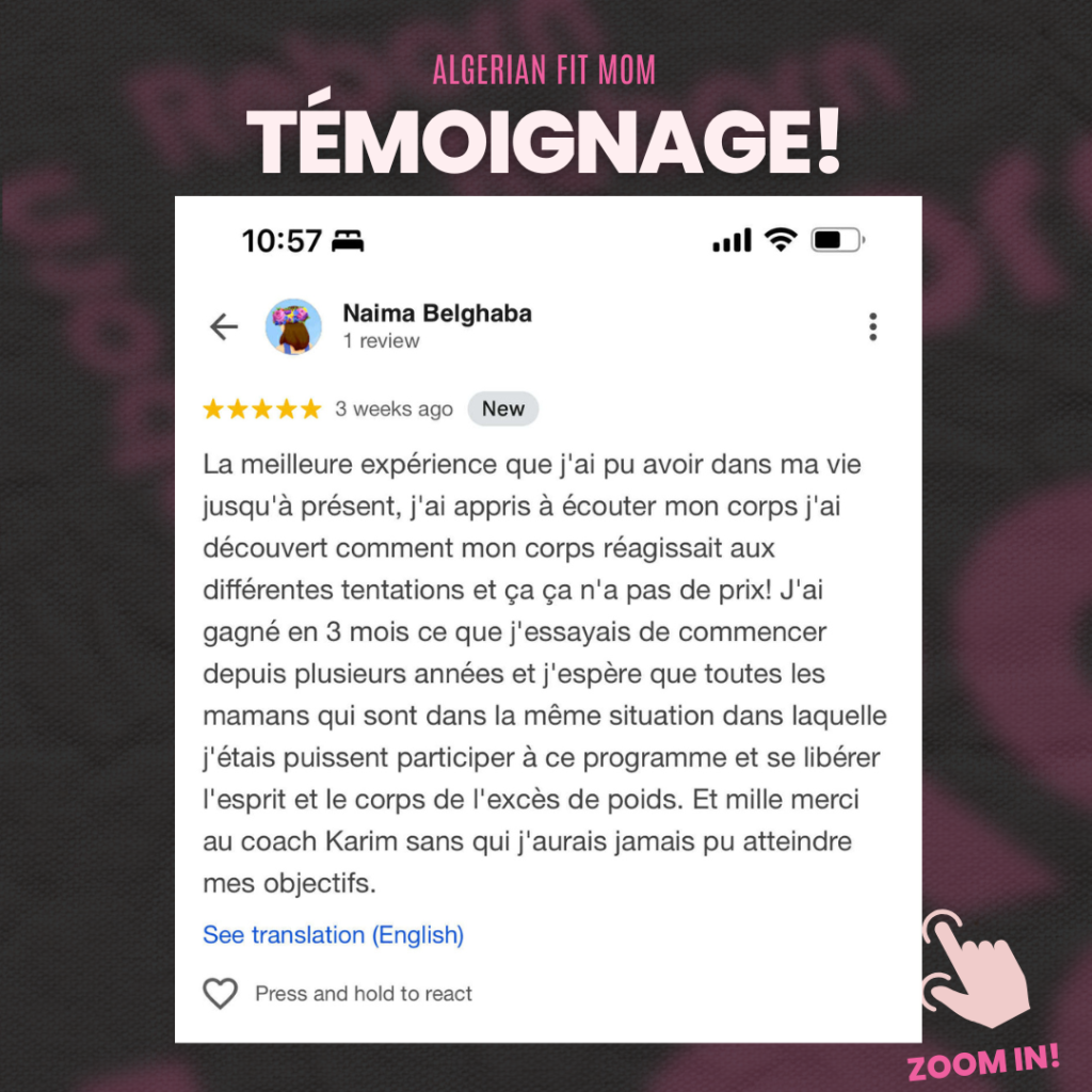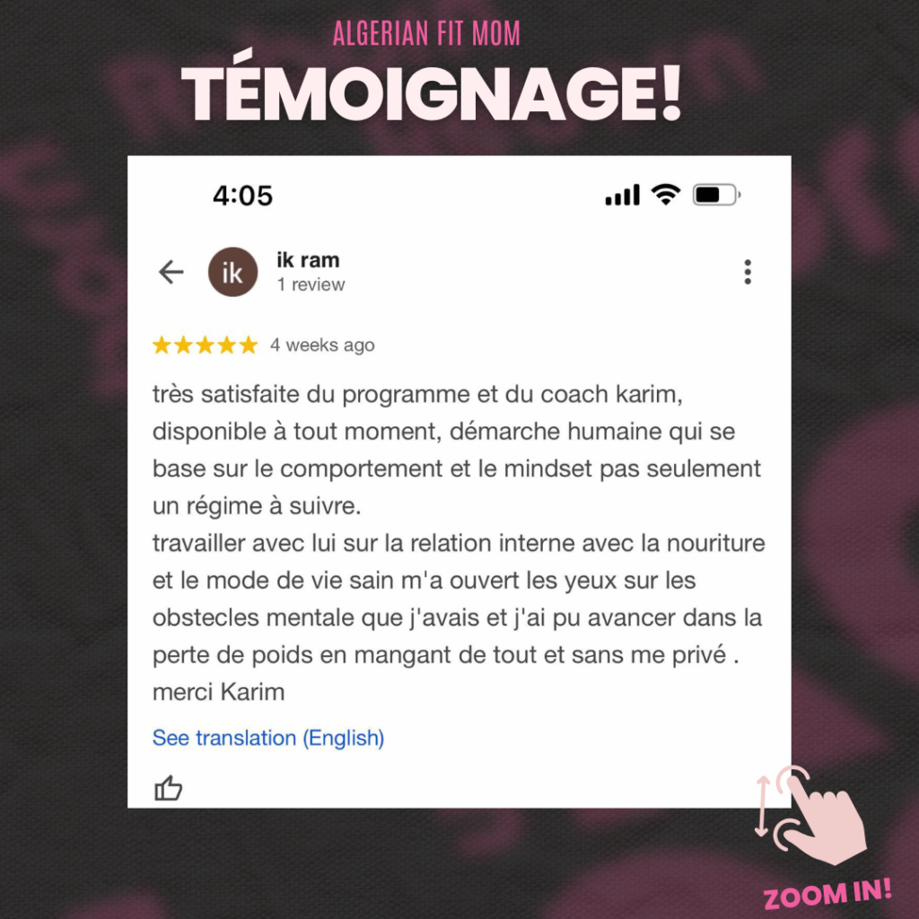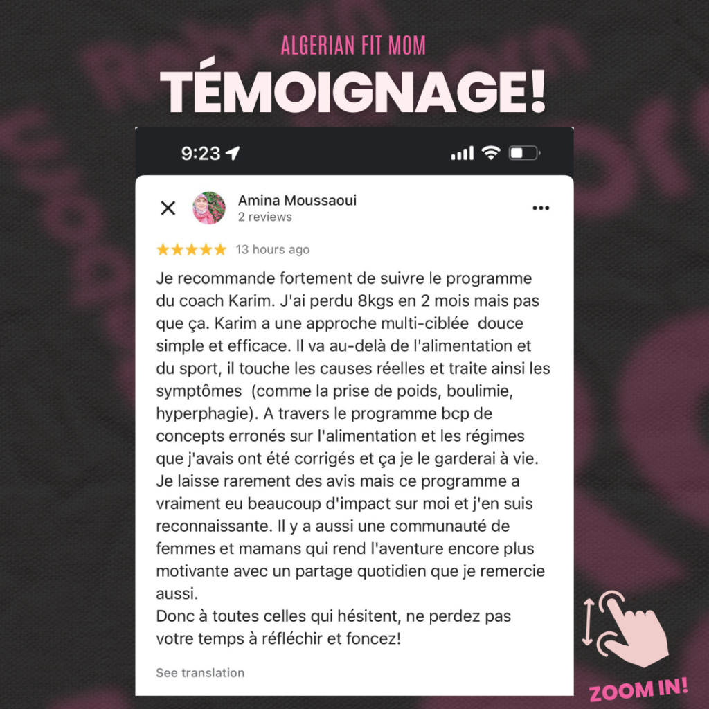 « J’étais persuadée qu’il fallait se priver de nos plats traditionnels pour perdre du poids. Aujourd’hui, je mange du couscous avec mes enfants sans culpabilité… et je continue à maigrir. Merci Coach Karim, je revis ! » ~ Sarah
